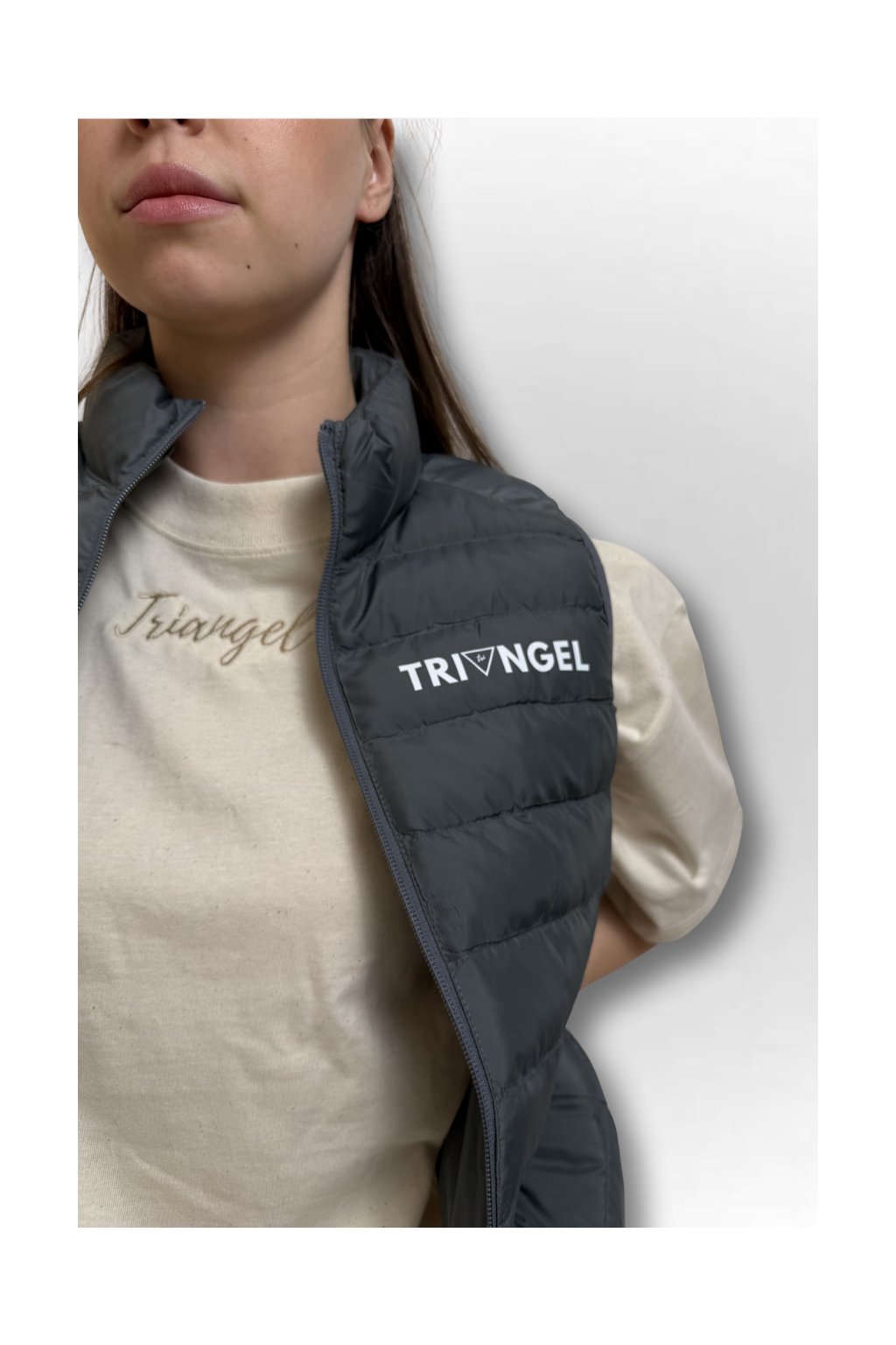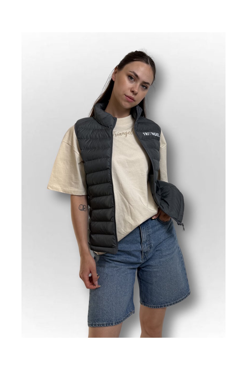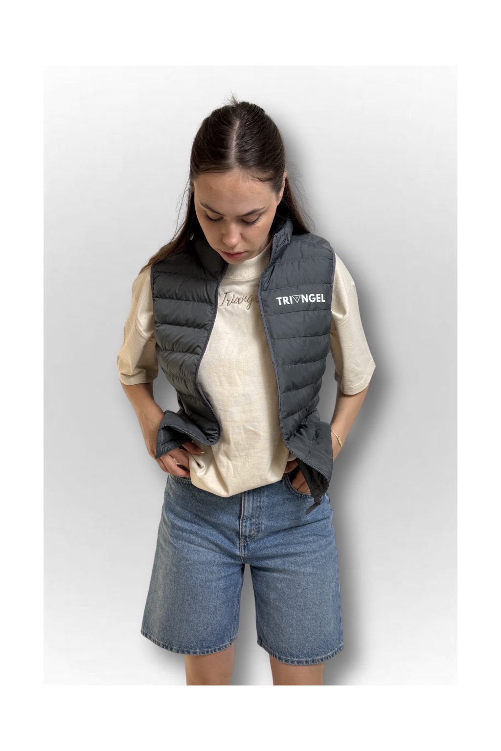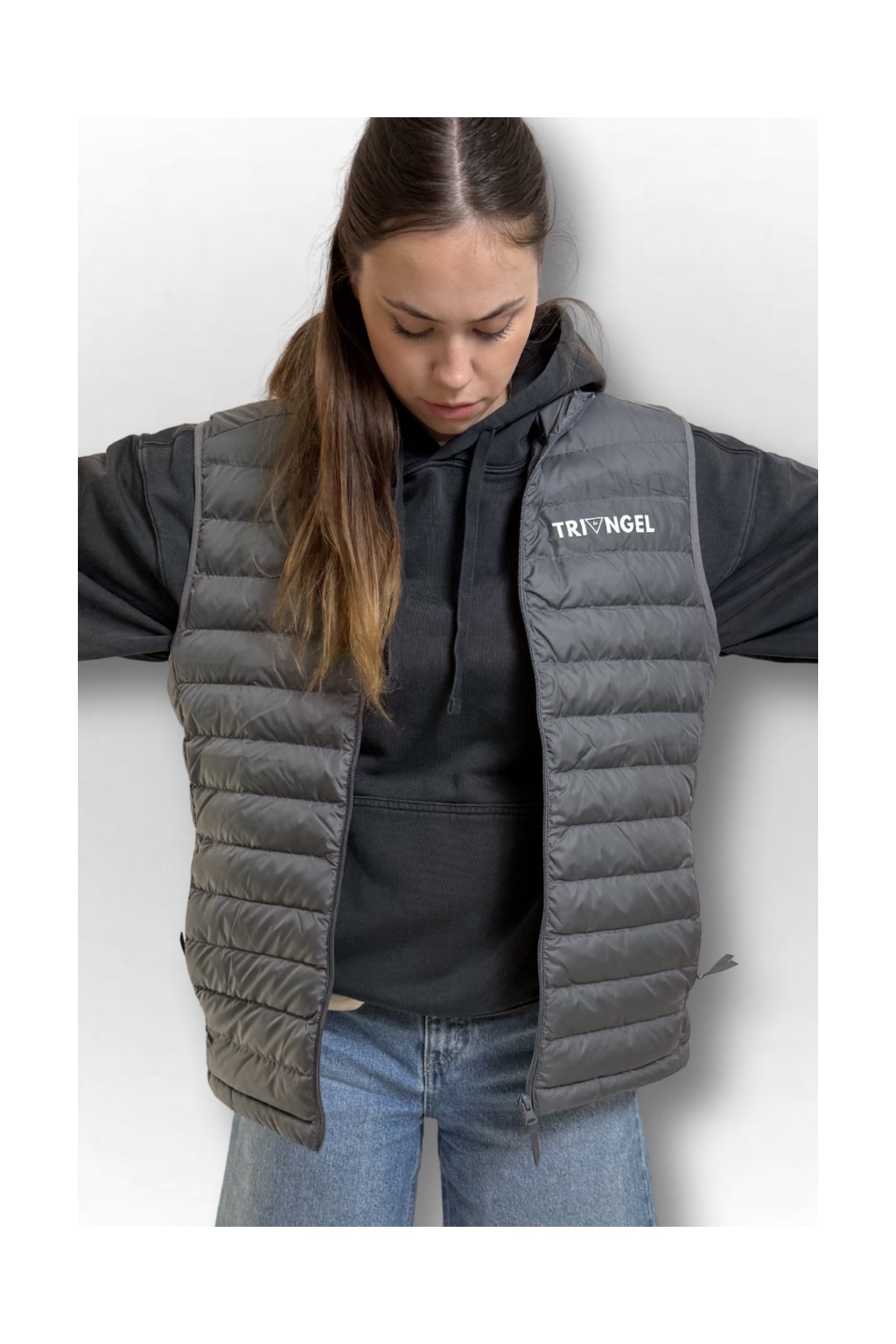 Klidná síla v šedé. Lehká vesta s čistým střihem a jemným Triangel logem na prsou. Funkční, ale ne sportovní. Stylová, ale ne přehnaná. Ideální vrstva na chladnější rána i večerní výpravy.
