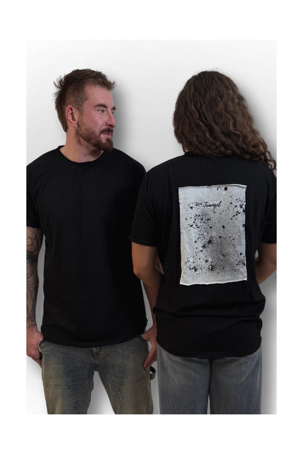 Tričko, co má šmrnc i tajemství. Na první pohled čistě černý kousek s prodlouženým střihem – ideál hlavně pro chlapy, ale sluší i holkám. Opravdové překvápko ale čeká na zádech: bílý obdelník s logem Triangel. Někdy postříkaný nebo posprejovaný barvou, jindy úplně čistý. Nikdy nevíš, která varianta ti dorazí – prostě malý mystery balíček v šatníku.